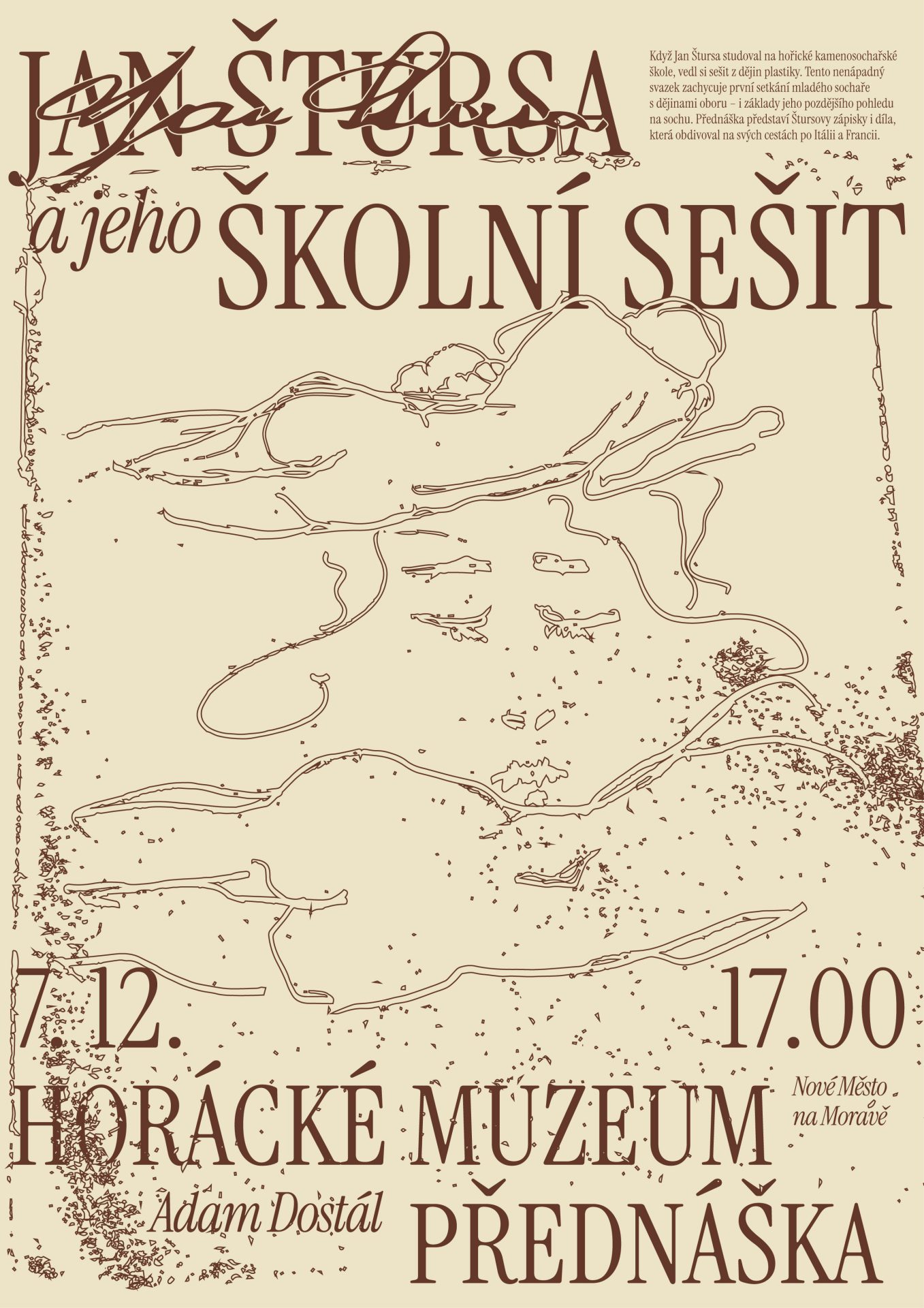 Přijďte si užít nedělní adventní podvečer se školním sešitem Jana Štursy. Adam Dostál, student dějin umění na Filozofické fakultě Univezity Karlovy, nám přiblíží obsah nenápadného sešitu z dějin plastiky, který objevil v archivu Akademie výtvarných umění. Mladý sochař si do něj zapisoval poznámky, ke kterým se později vracel a při svých cestách po Itálii a Francii se jimi nechával vést. Přednáška přiblíží jeho zápisky i díla, která na těchto cestách obdivoval.