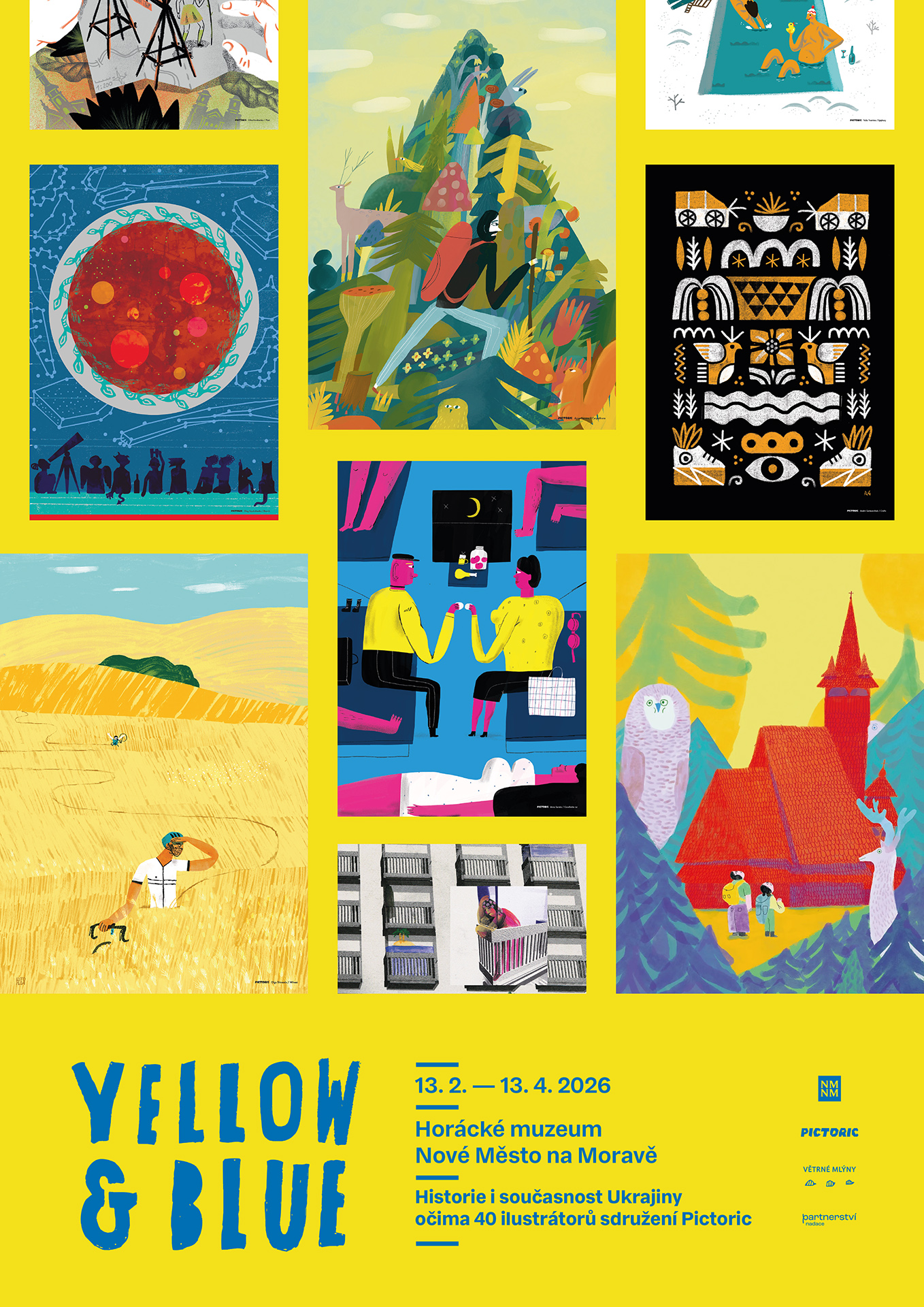 Projekt Yellow & Blue z dílny ukrajinských ilustrátorů sdružení PICTORIC je živou a mnohovrstevnatou snahou zprostředkovat střípky současné Ukrajiny a její historie očima více než třiceti výtvarníků. Výstava zve návštěvníky, aby se dívali dál – za jednotlivé fragmenty – a objevovali Ukrajinu v celé její rozmanitosti. Tato série zachycuje křehkou, ale zásadní rovnováhu mezi zranitelností a odolností, která silně rezonuje v kontextu probíhající války. Představuje mozaikový obraz země na pomezí minulosti a přítomnosti – od lidových slavností, tradičních pokrmů, hudebních nástrojů až po post-sovětská sídliště s chaotickými balkony.Ukrajinci dnes bojují i za to, aby každý z těchto fragmentů měl právo na existenci.